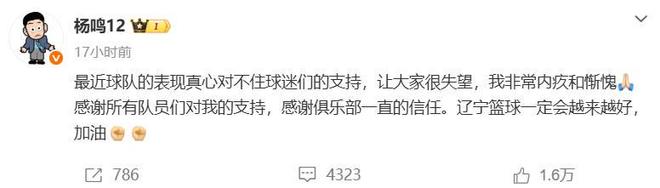 田掌門也發(fā)文表示遼寧隊末節(jié)四分的表現(xiàn)才讓楊鳴決定離開。