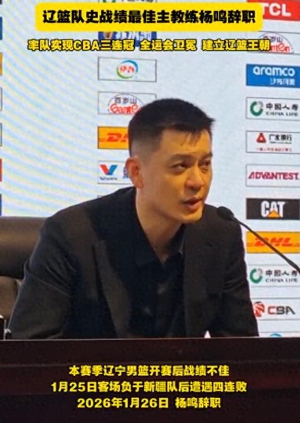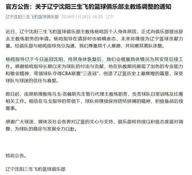 1月26日,遼寧男籃俱樂部官宣楊鳴由于身體原因辭去了主教練一職。