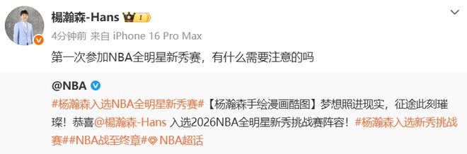 北京時間1月27日,NBA官方曬出了楊瀚森的手繪漫畫形象,并配文寫道:“夢想照進現實,征途此刻璀璨!恭喜楊瀚森入選2026NBA全明星新秀挑戰賽陣容?!睏铄救宿D發了這條社媒,并回應道:“第一次參加NBA全明星新秀賽,有什么需要注意的嗎?”