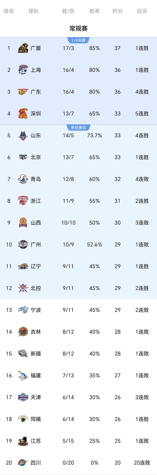 北京時間1月27日晚上,CBA常規賽第20輪繼續進行,總共七場,青島男籃輸給廣廈男籃、山東男籃大勝寧波男籃、上海男籃大勝廣州男籃、深圳男籃大勝福建男籃、四川男籃慘敗遼寧男籃、浙江男籃大勝江蘇男籃、同曦男籃險勝新疆男籃,上演悲喜一夜。