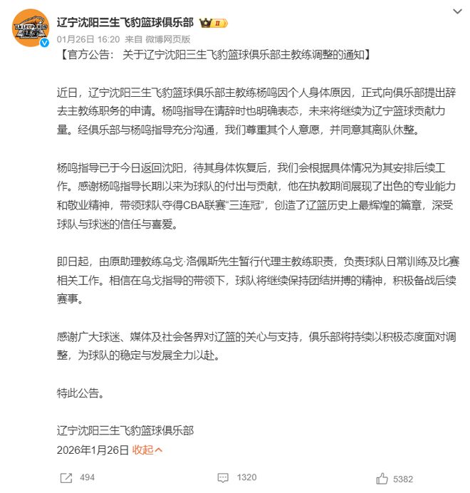 四連敗后楊鳴指導辭職,助理教練烏戈暫代主教練。