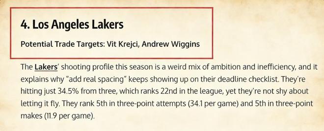 據(jù)NBA記者Fran Leiva報道,湖人在交易截止日前的目的明確,他們希望引入足夠有威脅的射手,來彌補這塊短板,而克魯伊奇和威金斯則是他們的兩位引援目標。