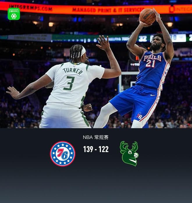 第四節76人麥凱恩拿下12分,雄鹿庫茲馬拿下5分,最終76人139-122戰勝雄鹿