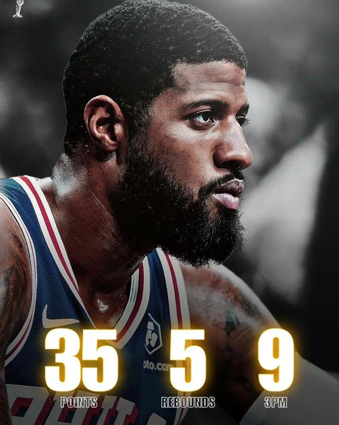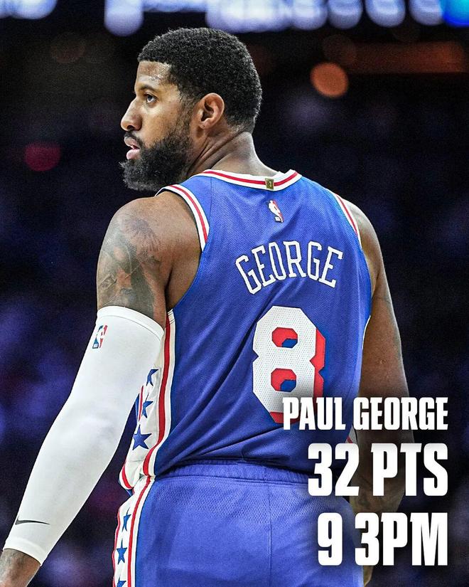 在本場(chǎng)之前,喬治本賽季一共為76人打了25場(chǎng)比賽,場(chǎng)均上場(chǎng)30.2分鐘,只能得到15.4分5.3籃板3.6助攻,三項(xiàng)命中率41.5%/36.4%/86.5%,真實(shí)命中率54.8%。