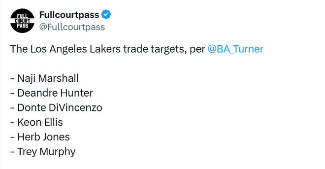 湖人隊記布拉德-特納撰文稱:“據多位NBA內部人士透露,與湖人隊傳出緋聞的潛在引援目標包括達拉斯獨行俠隊的納吉-馬紹爾——他曾是東契奇的隊友,此外還有克利夫蘭騎士隊的德安德烈-亨特、明尼蘇達森林狼隊的唐特-迪文琴佐以及薩克拉門托國王隊的基翁-埃利斯。新奧爾良鵜鶘隊的特雷-墨菲三世和赫伯特-瓊斯也是湖人表現出興趣的兩名球員,聯盟中多支球隊同樣對他們有意。不過據NBA消息人士透露,鵜鶘對這兩人的要價極高,各隊都在觀望,等待其在下周交易截止日前是否會降低籌碼。”