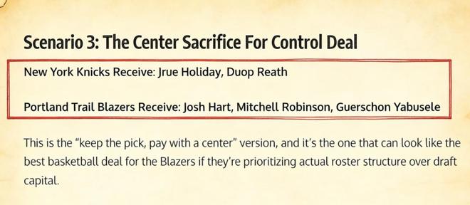 美媒《Fadeaway World》則撰文提出了一套3換2的交易方案,建議尼克斯送出哈特、羅賓遜和亞布塞萊,從開拓者引入霍勒迪以及里斯。