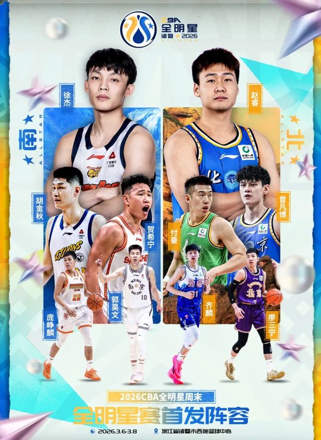 南區首發球員是徐杰、胡金秋、賀希寧、郭昊文和龐崢麟;北區首發球員是趙睿、曾凡博、付豪、齊麟和廖三寧。