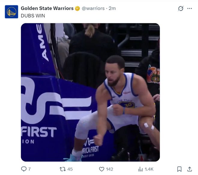 庫里再一次又在客場跳舞了,這場比賽勇士8人上雙而且全隊命中23個三分球非常恐怖,庫里的開心溢于言表。