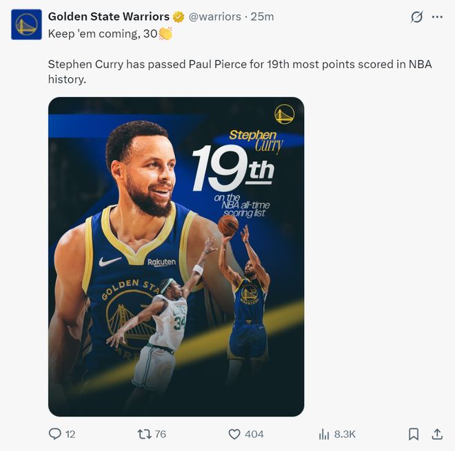 庫里在nba歷史得分榜上超越保羅-皮爾斯獨享第19位。