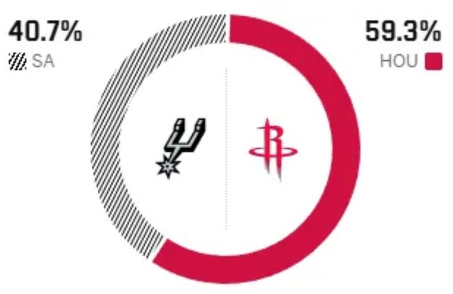 賽前,美媒ESPN對本場比賽進行了勝率預(yù)測,火箭隊勝率依舊高達59.3% ,占據(jù)絕對上風,馬刺勝率則僅有40.7% 。