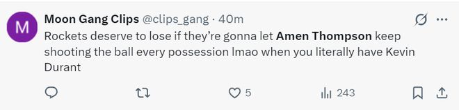 火蜜:火箭如果每一輪進(jìn)攻都讓阿門去發(fā)起、終結(jié)那必然會(huì)輸球,尤其是隊(duì)內(nèi)還有杜蘭特的時(shí)。