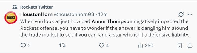 休媒:當(dāng)你仔細(xì)想想阿門對(duì)火箭隊(duì)進(jìn)攻造成的負(fù)面影響之嚴(yán)重時(shí),你不禁會(huì)想,是不是應(yīng)該把他放到交易市場(chǎng)上拋售一番,看看能否淘到一位既不防守糟糕又具備明星實(shí)力的球員呢?