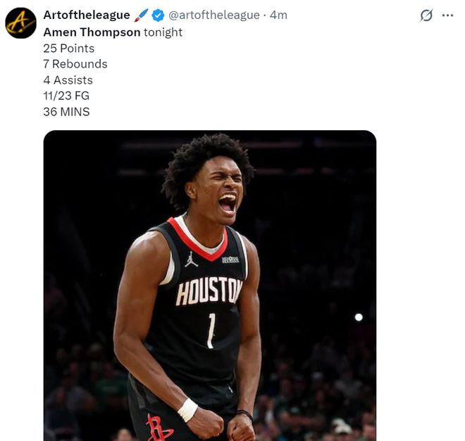 此役阿門-湯普森全場(chǎng)比賽36分鐘,23中11,罰球3中3,拿到火箭最高的25分外加7分4籃板4搶斷1蓋帽,命中率47.8%,整個(gè)第四節(jié)7中1拿2分,他出手是火箭最多。