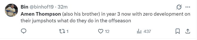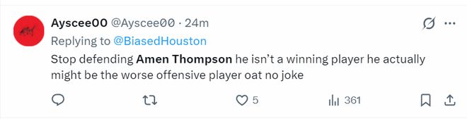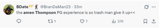 火蜜:阿門-湯普森在進(jìn)攻方面太沒用了。他完全破壞了球的運(yùn)轉(zhuǎn)節(jié)奏,因?yàn)樗谇驁?chǎng)上的任何位置都不具備威脅性,只有在籃下才有威脅。