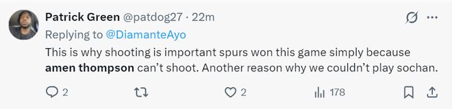 刺蜜:這就是為什么投籃能力如此重要,因?yàn)榘㈤T無法投籃所以馬刺贏得了比賽,此外我們不讓不會(huì)投籃的索漢登場(chǎng)也是贏球原因之一。
