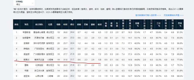 本賽季19次出場后,郭昊文場均可完成14.6次出手、8.5次罰籃出手,投籃命中率為44.8%,場均可為球隊貢獻21.7分2.9籃板5.8助攻。其中他的場均得分數可力壓多隊外援位居聯盟第6,場均罰籃數則高居聯盟第二。這就是他攻堅能力、消化球權能力突出的體現。