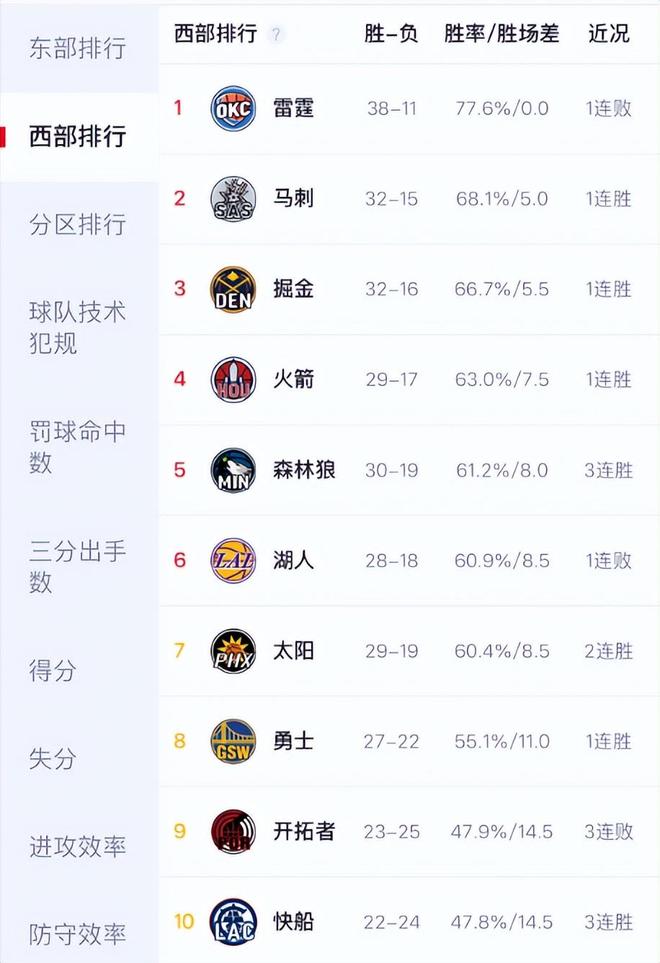 目前西部前十的排名:雷霆、馬刺、掘金、火箭、森林狼、湖人、太陽、勇士、開拓者、快船。