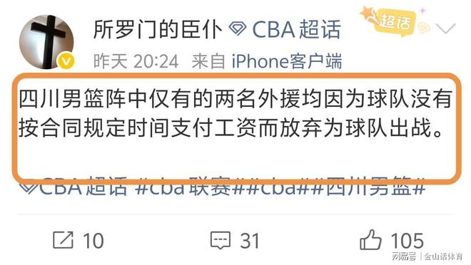 值得一提的是,本場(chǎng)比賽前,據(jù)媒體人“所羅門的臣仆”社媒發(fā)文爆料:四川男籃陣中僅有的兩名外援均因?yàn)榍蜿?duì)沒(méi)有按合同規(guī)定時(shí)間支付工資而放棄為球隊(duì)出戰(zhàn)。”,隨后,“所羅門的臣仆”又補(bǔ)充表示“兩個(gè)外援目前還沒(méi)見(jiàn)過(guò)工資。”。由于兩名外援罷賽,四川隊(duì)只能全華班出戰(zhàn),結(jié)果又是一場(chǎng)慘敗。