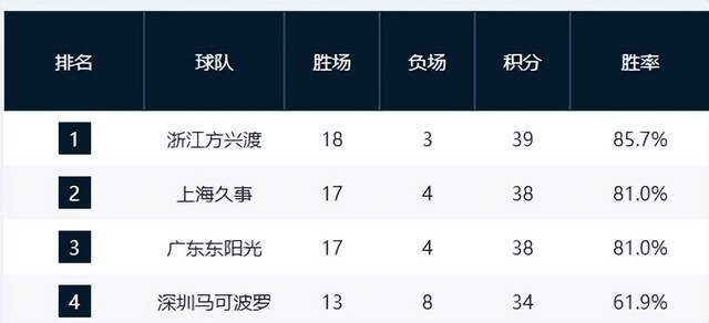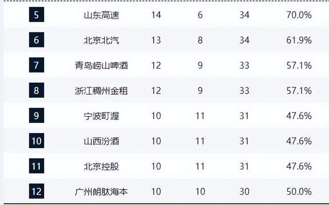 第4至第8名競爭異常膠著:青島隊與浙江隊同為12勝9負,分列第七、第八;青島隊遭遇五連敗,狀態(tài)低迷,而浙江隊則保持穩(wěn)定。此五隊之間僅差1至2個勝場,任何一場勝負都可能引發(fā)排名洗牌。