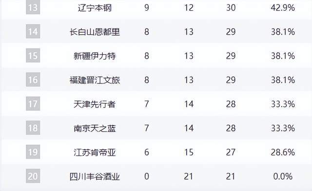 遼寧隊作為四冠王,戰(zhàn)績滑落至9勝12負,排名跌至第13位,賽季表現(xiàn)遠低于預期。福建隊、新疆隊、吉林隊同為8勝13負,陷入中游泥潭。同曦隊(7勝14負)、天津隊(6勝15負)、江蘇隊(5勝16負)與四川隊(0勝21負)則深陷倒數(shù)深淵,其中四川隊已遭遇21連敗,創(chuàng)CBA歷史最差開局紀錄。