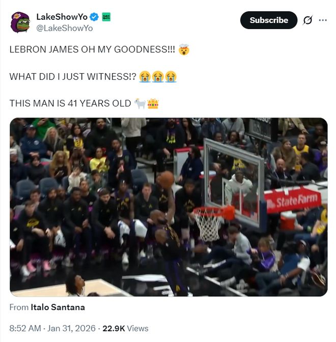北京時間1月31日,湖人大勝奇才。這場比賽41歲的勒布朗-詹姆斯再一次證明了他的身體狀態有多么出色,空接暴扣、外線三分、反擊上籃、策應進攻、低位單防無所不能,41歲的勒布朗還如此恐怖他應該得到多一些贊譽,全場比賽29分鐘打卡拿到20+6。