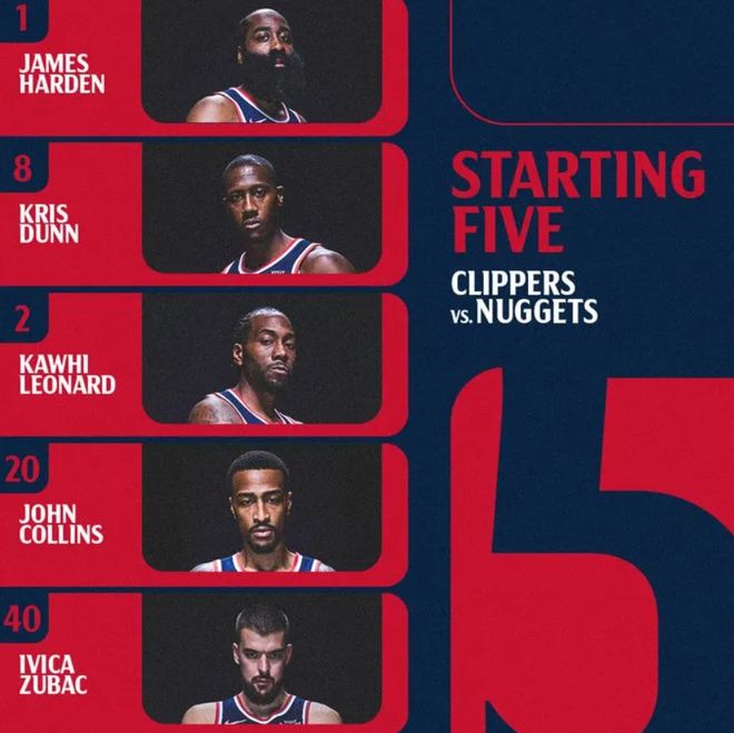首發陣容方面,快船隊這邊,小瓊斯、波格丹、比爾繼續缺陣,保羅也還是未隨隊(待交易狀態),倫納德繼續帶傷出戰,泰倫盧教練排出的最新首發五人組為:詹姆斯-哈登、克里斯-鄧恩、科懷-倫納德、約翰-科林斯、伊維察-祖巴茨;掘金隊這邊,布勞恩、約翰遜、戈登缺戰,約基奇復出,首發陣容則為:賈馬爾-穆雷、皮克特、沃特森、斯賓塞、約基奇。