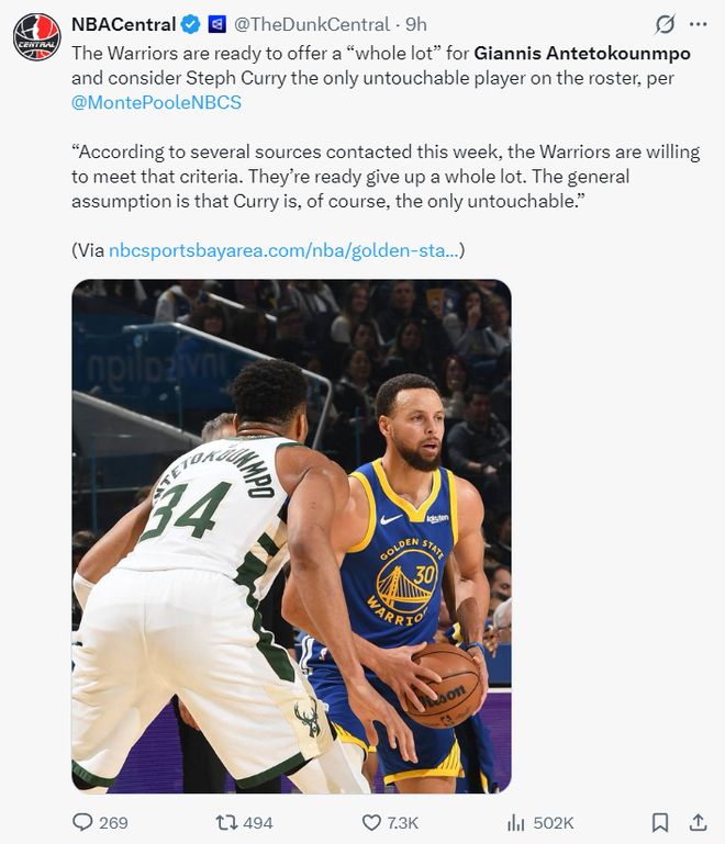 賽前根據NBC的報道,勇士會對揚尼斯進行豐厚的報價,勇士內部只有庫里一人是非賣品。