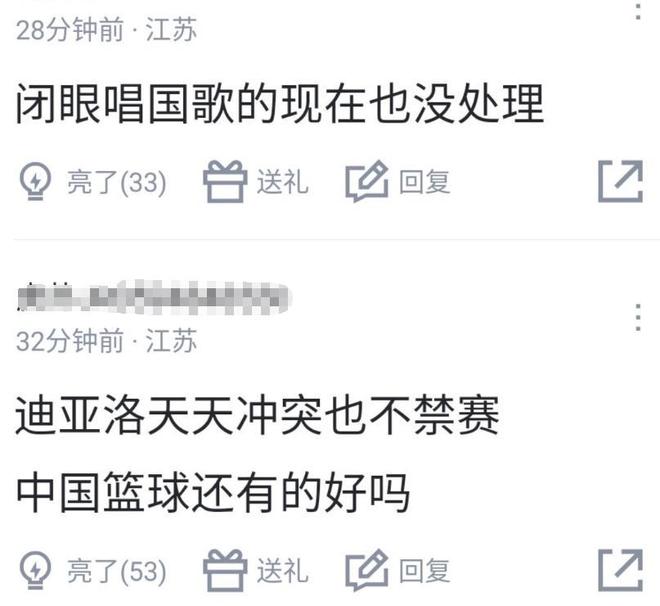 另一部分球迷則對CBA表達了不滿,分別拿了迪亞洛和前段時間在奏唱國歌儀式中沒有行注目禮的徐遠征來說事:迪亞洛天天沖突也不禁賽,中國籃球還有的好嗎?閉眼唱國歌的現在也沒有處理!