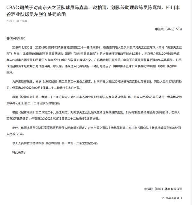 2月1日上午,CBA公司發布公告,因臨近比賽結束時發生沖突,同曦男籃球員馬鑫鑫被停賽1場且罰款人民幣5萬元;四川男籃球員左朕年被停賽1場且罰款人民幣5萬元;同曦男籃領隊兼助教陳嘉凱、球員趙柏清分別被停賽1場且罰款人民幣2萬元;依照本賽季CBA聯賽賽風賽紀責任人制度相關規定,同曦男籃主教練王世龍、四川男籃主教練楊城分別被追加處罰人民幣1萬元。