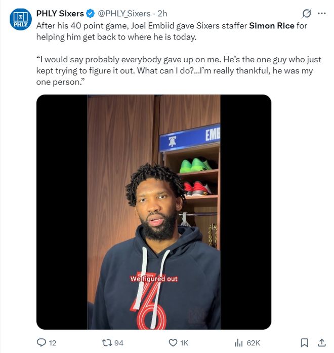恩比德在賽后感謝了一位名叫Simon Rice的工作人員,他說道:當時可能所有人都已經放棄我了,只有他一人還在想辦法幫助我。我還能怎么做呢?我只能感激他,那段時間他是我唯一的依靠。