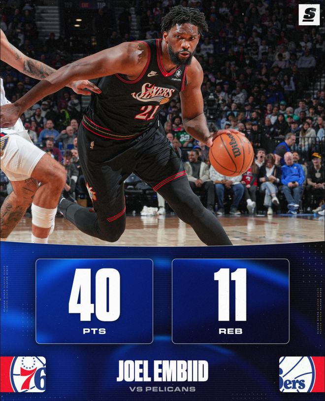 這場比賽恩比德鏖戰39分鐘,27中13,三分5中3,罰球14中11,拿到40分11籃板4助攻1搶斷2蓋帽,命中率48.1%,三分命中率60%,真實命中率53.7%,正負值+16。