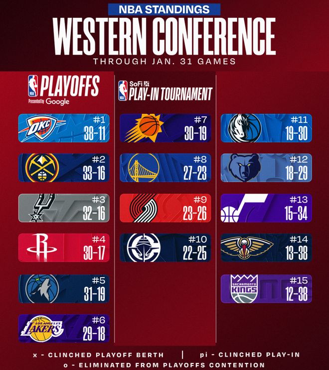 火箭跟馬刺只差1.5個勝場,森林狼與火箭只差0.5個勝場,湖人距離森林狼0.5個勝場,太陽跟湖人沒有勝場差,只要湖人輸球/太陽贏球,那么湖人就會掉到附加賽。