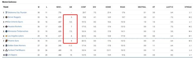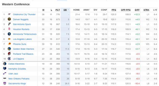 目前西部準確的排名情況:雷霆、掘金、馬刺、火箭、森林狼、湖人、太陽、勇士、開拓者、快船、獨行俠、灰熊、爵士、鵜鶘、國王。