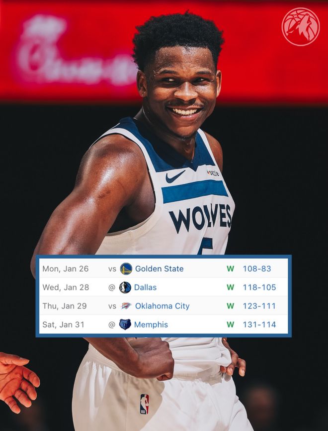 森林狼131-114大勝灰熊拿到四連勝,愛德華茲拿到33分3助攻,蘭德爾27+7+7,麥克丹尼爾斯20+4,里德20分9籃板5助攻,森林狼這一波四連勝后已經(jīng)穩(wěn)穩(wěn)壓制湖人、太陽,他們險些跟火箭的勝場持平,但火箭擊敗獨行俠后再度領(lǐng)先森林狼0.5個勝場。