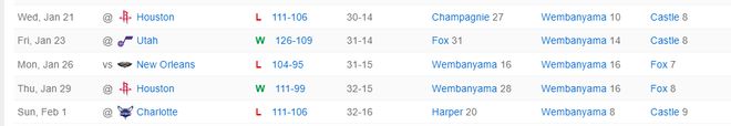馬刺過去的五場比賽已經輸掉三場,就連爵士、黃蜂都能輸,文班亞馬的穩定性出現了巨大的問題。