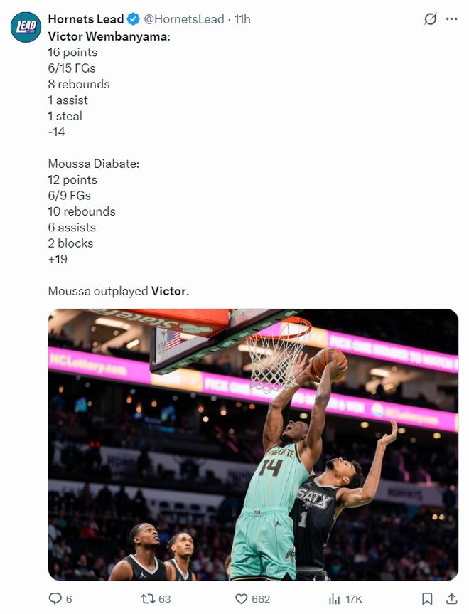 而跟文班亞馬對位的2022年次輪43順位的中鋒迪亞巴特,全場比賽33分鐘,9中6,拿到12分10籃板6助攻2蓋帽,命中率66.7%,正負值+17,文班亞馬2.24米,迪亞巴特只有2.08米,兩人的強硬程度完全不同。