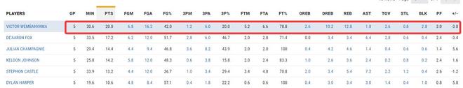 過去的五場比賽文班亞馬場均30.6分鐘,拿到20分12.8籃板1.8助攻0.8搶斷2.8蓋帽2.8失誤,命中率42%,三分命中率20%(場均出手6個三分球),這也難怪文班亞馬被批判已經變為魯迪-戈貝爾了。