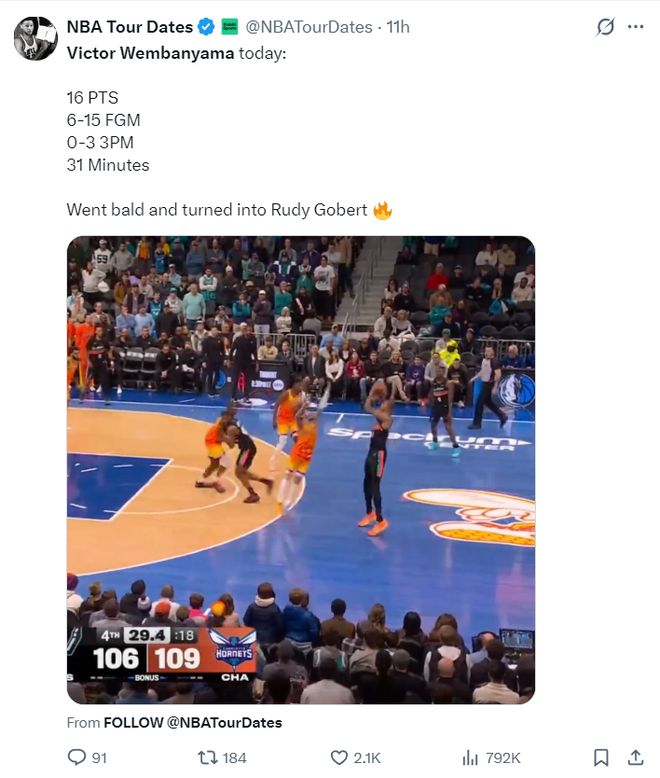 全場比賽文班亞馬31分鐘,15中6,三分3中0,拿到16分8籃板1助攻1搶斷0蓋帽,正負值-14,命中率40%。