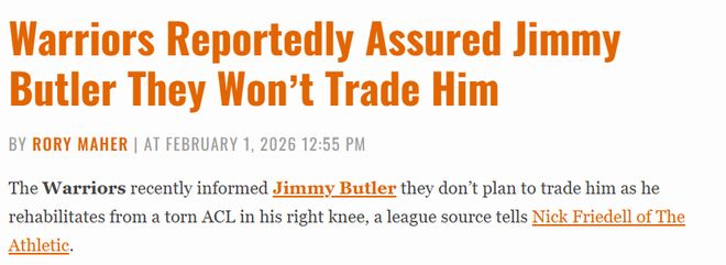 北京時(shí)間2月2日,據(jù)勇士隊(duì)記弗里德?tīng)枅?bào)道,聯(lián)盟消息人士透露,勇士隊(duì)近期已向吉米-巴特勒做出承諾,鑒于其正處于右膝前交叉韌帶撕裂的康復(fù)期,球隊(duì)計(jì)劃不會(huì)將其交易。
