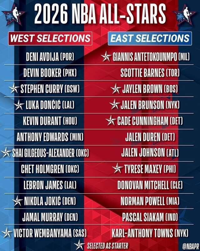 先來看看本次全明星的具體24人大名單,首發這邊西部:亞歷山大、東契奇、庫里、文班亞馬和約基奇,東部馬克西、字母哥、布倫森、康寧漢姆和杰倫·布朗。