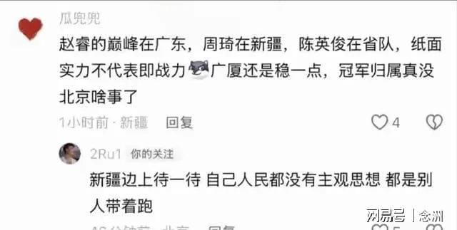 還有新疆的網友寫道:趙睿的巔峰在廣東,周琦在新疆,陳英俊在省隊,紙面實力不代表即戰力,廣廈還是穩一點,冠軍歸屬真沒北京啥事了。”趙睿回復道:“新疆邊上待一待,自己人民都沒有主觀思想,都是別人帶著跑。”