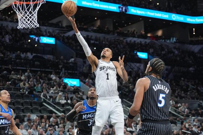 馬刺力克魔術(shù),文班亞馬又是攻防一體,完爆對(duì)面的狀元班凱羅。上半場他投籃5中3,三分球1中0,罰球6中4,拿到10分5籃板1助攻2搶斷3蓋帽。