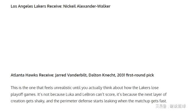 那么湖人如果有機(jī)會(huì)拿到亞歷山大-沃克,送走范德比爾特和克內(nèi)克特,似乎就顯得不值一提了。因?yàn)檫@兩名球員,就沒什么市場行情,范德比爾特頂多是合格替補(bǔ)輪換,但薪資卻有些高了。克內(nèi)克特則直線下滑,現(xiàn)在根本沒什么機(jī)會(huì),所以對于老鷹來說,這筆交易方案最大收益,應(yīng)該就是等著如果2031年湖人競爭力下滑,甚至直接展開重建,那個(gè)選秀權(quán)順位會(huì)比較高。