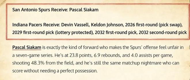 美媒《Fadeaway World》提出了一套6換1的交易方案,建議馬刺引入步行者前鋒西亞卡姆。具體方案為——