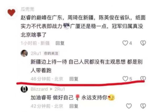 結(jié)果在賽后,氣急敗壞的趙睿打開了個人社媒賬號,開始跟球迷對線,其中就瞄準了IP在新疆的球迷,開始胡亂說話,一下子引起了新疆球迷的憤怒。更為關(guān)鍵的是,趙睿的措辭出現(xiàn)了很嚴重的錯誤,他針對的不僅僅是球迷,而是更廣大的群體。