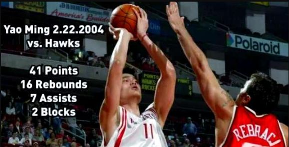 姚明23歲5月10天,2004年2月22日,火箭三加時險勝老鷹,姚明出戰50分鐘,打出NBA生涯代表作,狂砍41分16板7助,第三加時獨攬8分統治比賽,得分助攻均創下生涯最高。