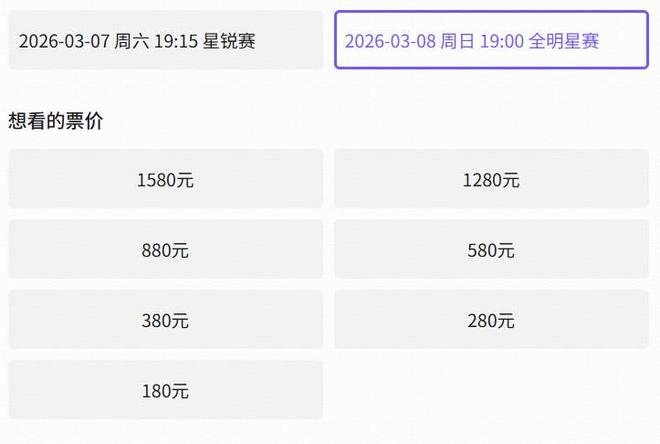 據(jù)票務(wù)網(wǎng)站顯示,全明星首日的票價(jià)最低50元,最高580元。次日的票價(jià)最低180元,最高1580元。