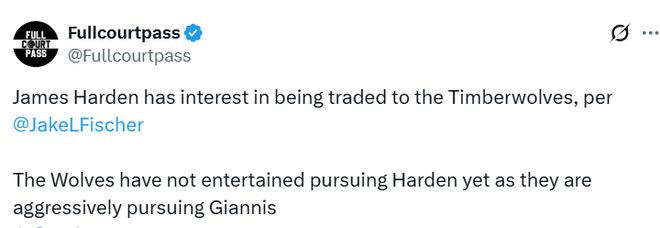 Fischer表示,哈登有意被交易至森林狼,然而,森林狼隊目前一心全力追逐字母哥,尚未考慮推進哈登相關(guān)的交易事宜。