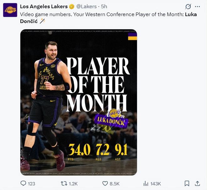 東契奇成為西部月最佳球員,場均34分9.1助攻7.2籃板。