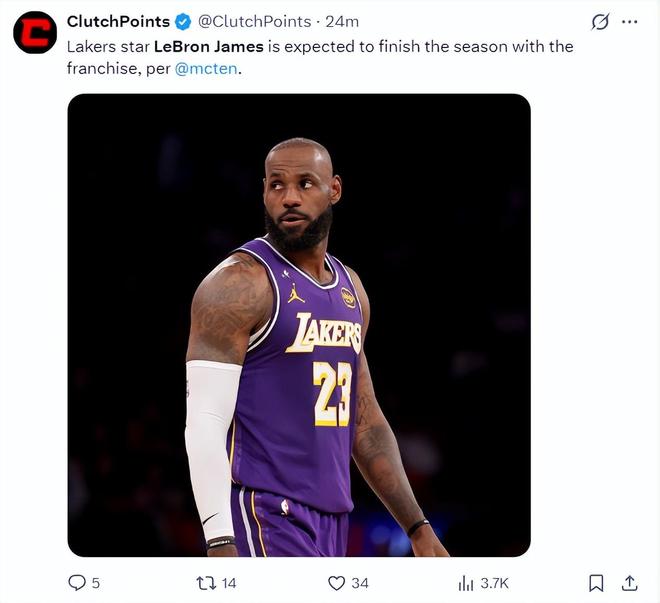 在這場比賽打到第二節,根據馬克-斯坦恩的報道,詹姆斯在本賽季交易截止日不會被交易,他將繼續代表湖人出戰。